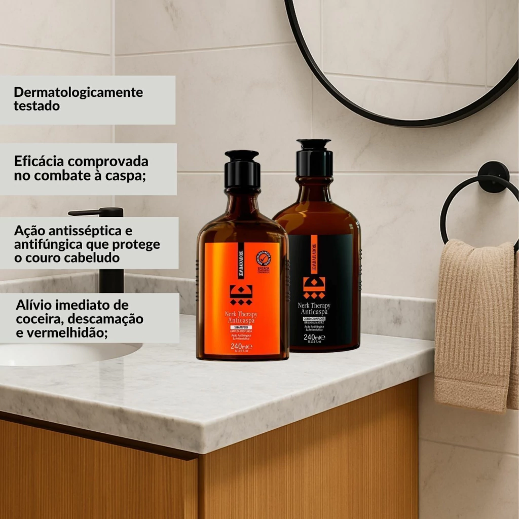 Chega de caspa, coceira e desconforto. O Kit Shampoo + Condicionador Anticaspa Nerk Therapy Embaixador foi desenvolvido para quem não aceita conviver com caspa e quer uma solução definitiva, eficaz e sem agredir os fios.