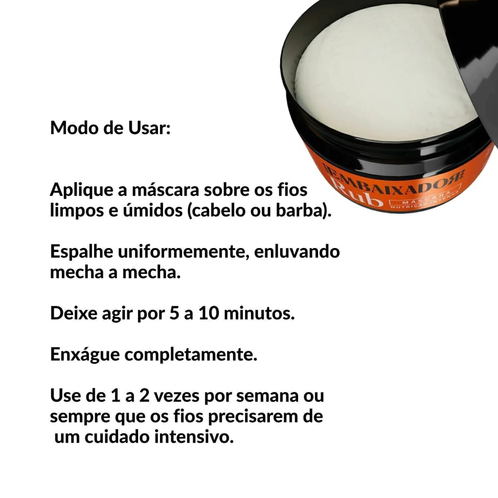 A Máscara Rub Embaixador foi desenvolvida para quem busca fios realmente bem tratados. Sua fórmula de alta performance combina ativos potentes de hidratação e nutrição, que penetram profundamente na fibra capilar, repondo água, nutrientes e lipídios essenciais.